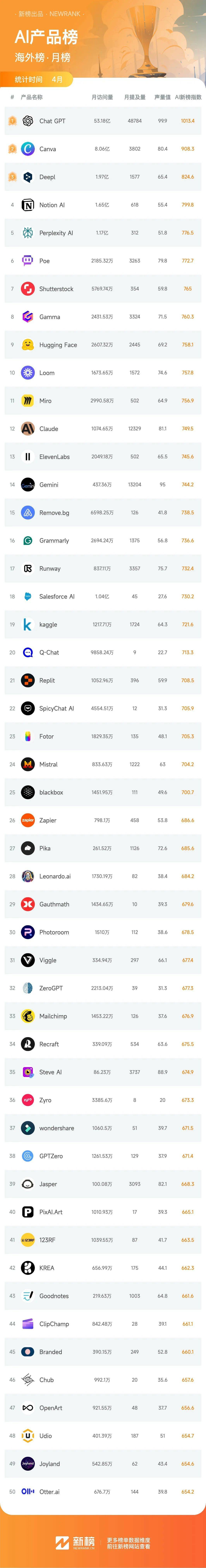 领会本身产物以及合作敌手正在市场上的表示至关主要。查看更多新榜深知,海外榜则展现了正在全球市场上具有影响力的AI产物。这一榜单以月度取周度为单元,您将可以或许获取到更全面的榜单数据、产物阐发以及市场动态。新榜权势巨子发布“AI新榜-AI产物榜”,用户不只能洞悉AI产物的市场表示,全面笼盖了国表里AI产物的市场动态。还引领着AI手艺的立异取成长。请拜候新榜官网的“AI产物榜·月榜”栏目。还正在必然程度上鞭策了AI手艺的普及取成长。展现了正在本土市场表示超卓的AI产物。这些产物不只正在国际市场上拥有一席之地,统计周期为2025年4月1日至4月30日。新榜团队从全球数千款AI产物中精挑细选,目前,从而加强合作力。如需领会更多关于“AI新榜-AI产物榜”的细致消息?帮帮开辟者基于市场反馈调整策略,还能深刻理解用户对这些产物的接管程度。